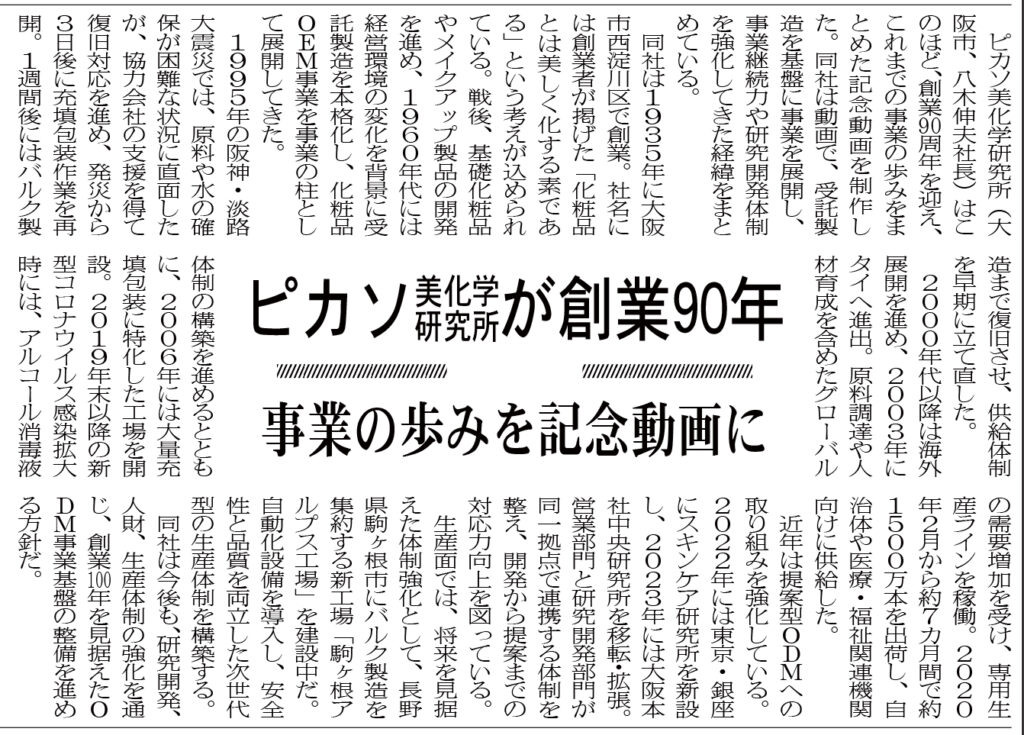 ピカソ美化学研究所(大阪市、八木伸夫社長)はこのほど、創業90周年を迎え、これまでの事業の歩みをまとめた記念動画を制作した。同社は動画で、受託製造を基盤に事業を展開し、事業継続力や研究開発体制を強化してきた経緯をまとめている。