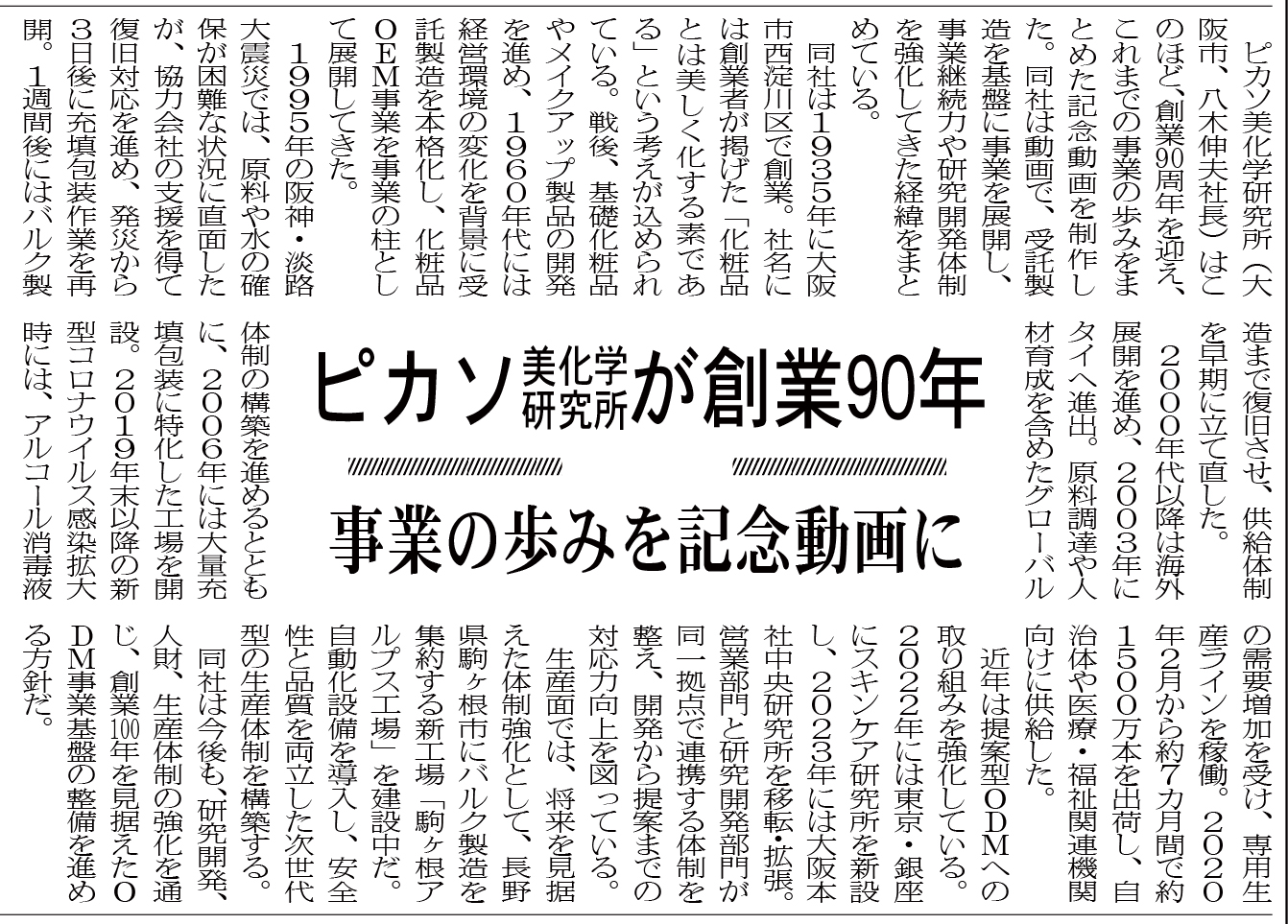 ピカソ美化学研究所が創業90年 事業の歩みを記念動画に